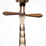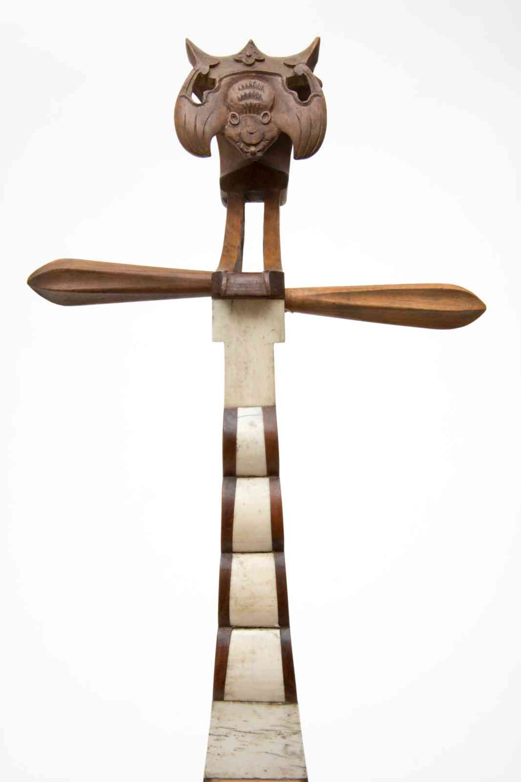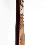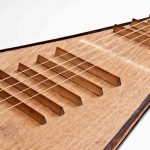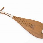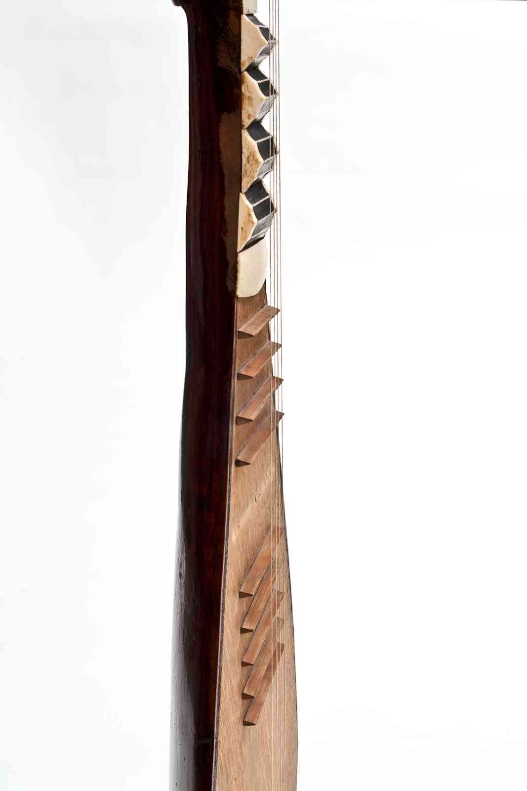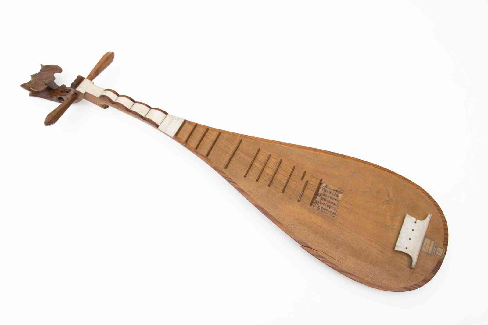 Si noti la grande quantità di tasti, posti alcuni sul manico e altri sulla tavola armonica. Quelli sul manico hanno una forma tale da consentire alle dita di scivolare fra un tasto e l’altro, ottenendo un tipico effetto di glissando e sono spesso fatti di avorio. E’ il caso dello strumento nella vetrina, il cui manico è caratterizzato da una decorazione molto tipica a forma di pipistrello. Questo animale, che nella tradizione occidentale è legato ad una simbologia negativa legata alla notte, alle tenebre e al male, in Cina invece rappresenta simbolicamente la fortuna: nella lingua cinese pipistrello si dice “fu”, suono uguale a quello usato per definire la buona sorte.
