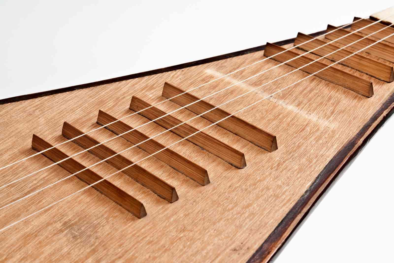 Originariamente veniva tenuto appoggiato alle ginocchia in senso orizzontale, come una chitarra e le sue corde di seta venivano sollecitate da un grande plettro. Oggi invece l’esecutore lo tiene in posizione verticale, appoggiandolo ad un ginocchio e pizzica le quattro corde metalliche per mezzo delle unghie o di plettri applicati alla punta delle dita.